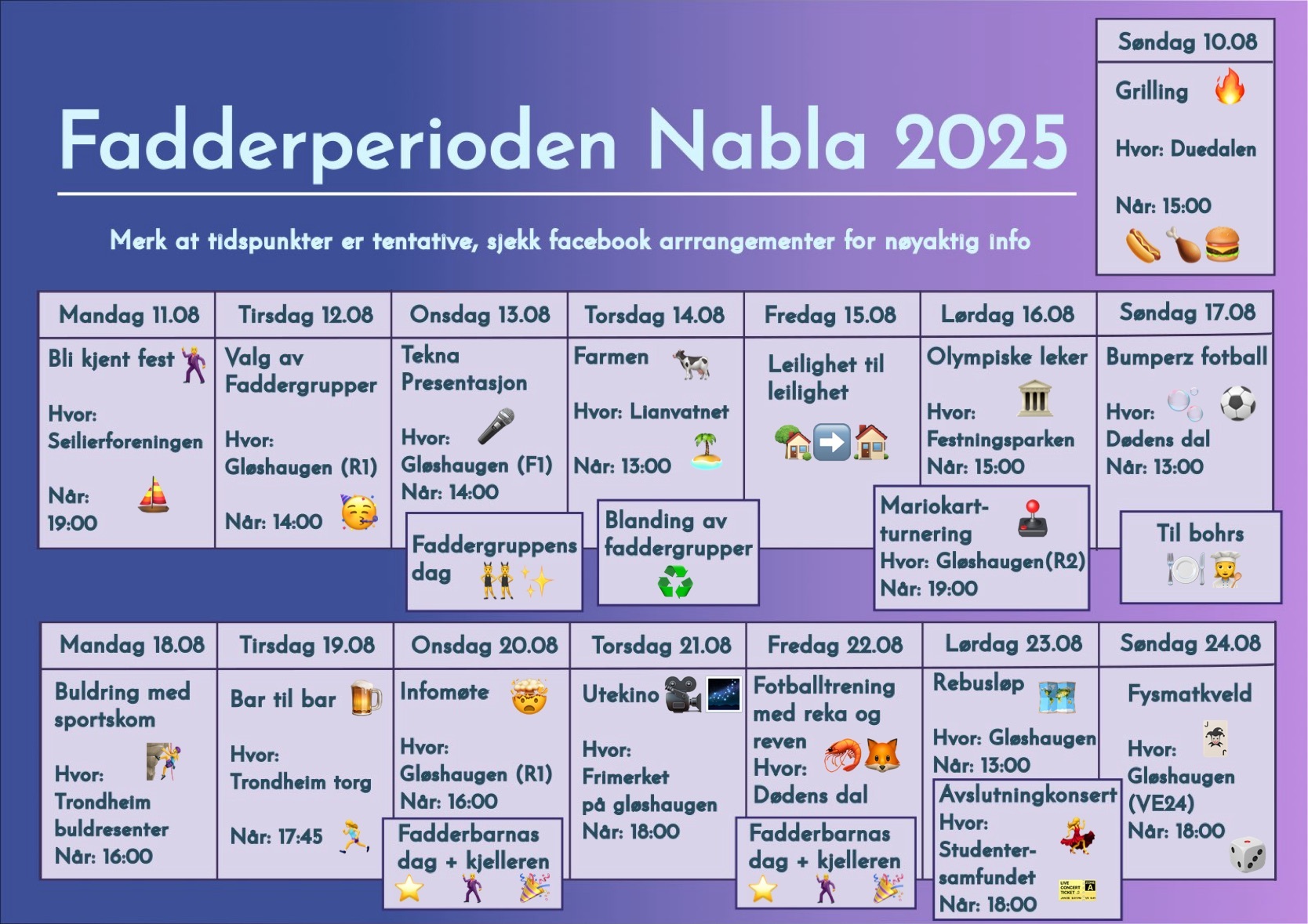 Fadderukene blir din første introduksjon til Nabla. Dette er to uker helt i starten av semesteret fylt med sosiale arrangementer hver eneste dag, og her er det noe for enhver smak! Enten du liker å feste, grille, drive med idrett eller musikk, bake, spille spill, se film, eller du er gira på absolutt alt så kommer du definitivt til å finne noe for deg! Under ser dere planen for årets fadderperiode!